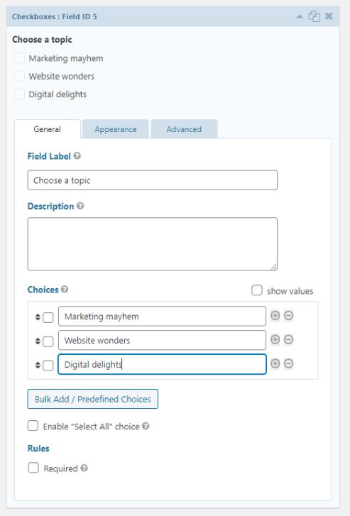 Let’s also add our Groups with a checkbox. I will simply insert the same options as I’ve already created them in my Mailchimp account.