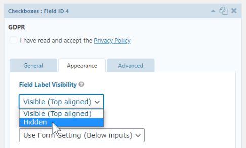 The link is set to open in a new window so it doesn’t lead people away from the actual signup form if they click it. Since the text is self-explanatory we can go to appearance and change the field label visibility to hidden.