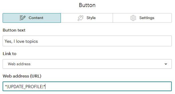 In the button link we choose “Web address” and insert the MERGE TAG for the “Update preferences” page: